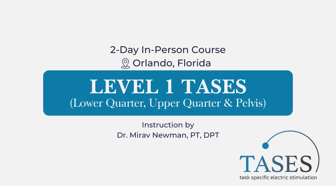 This is a Level 1 course that combines upper and lower quarter TASES into two full days packed with lecture, labs, and live demonstrations. This class is for beginners that want to learn how to get started with task specific electric stimulation. Protocols using one unit or two units for sitting, standing, walking, and reaching are included. Get registered now and take your practice to the next level with an in person hands on learning experience. This course will take place on October 23rd-24th, 2026 in Orlando, Florida from 8:30am-5:30pm EST. This is a two-day in-person class focusing on Basic Introduction to TASES (Task Specific Electric Stimulation).